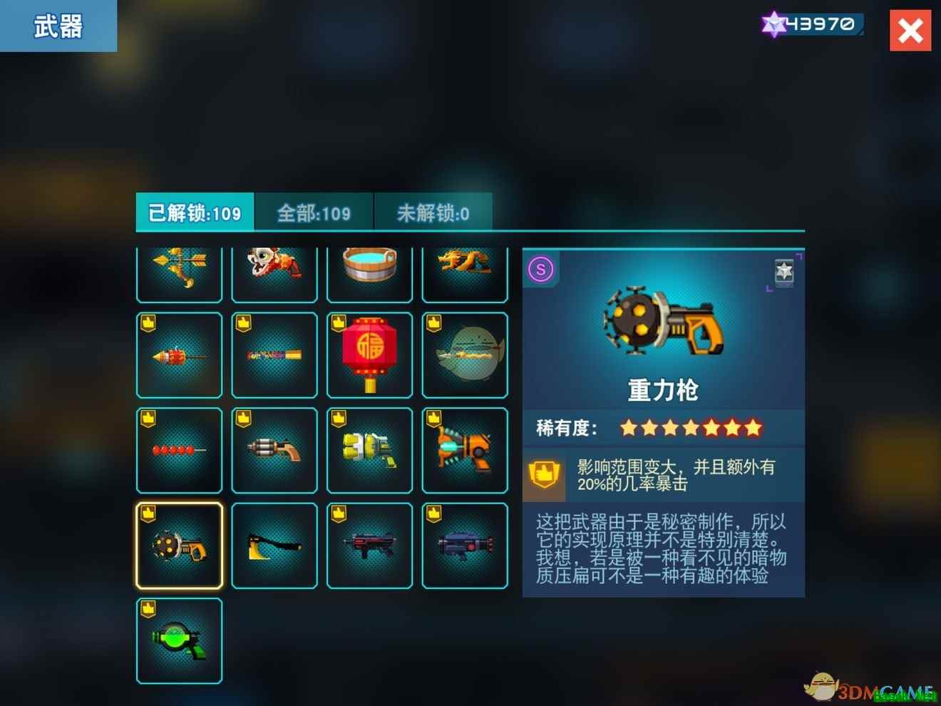 重力枪 超能武器 解锁方式:宫艾莎正常宇宙通关获得 未满熟练度没有活性就是个渣渣,n炮才命中一炮,打的怀疑人生。耗弹少,群攻,吃各种被动,并且概率眩晕怪物打断技能定身大法。满级天壤之别,基本泡泡中。又是一个差别巨大武器。 总之,少年,努力练他吧,推荐有活性下,练级