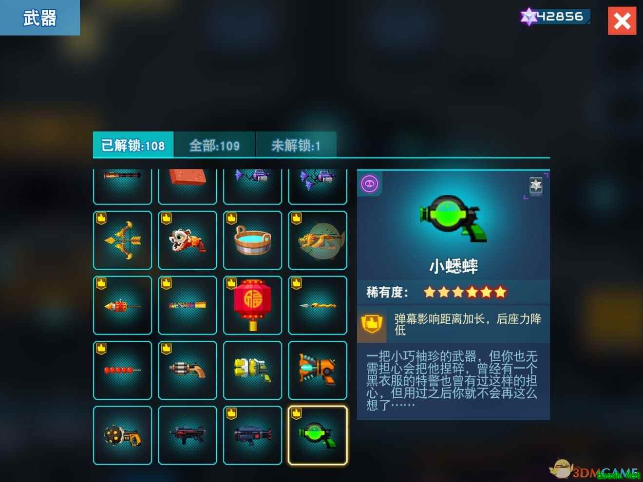 小蟋蟀手枪 化学武器 解锁方式:达布斯挑战 优点,耗弹少,弹幕大,可群攻,射速较慢,吃活性系列和火力,伤害可观 缺点,后坐力大,不容易控制,射程较短,配分解因子弊大于利。普通下,清小怪可以,boss后座太大,容易伤血。平行下,有活性,也能清小怪。满熟练度下,此枪射程和后座好不少,推荐满熟练度,此枪解锁容易。