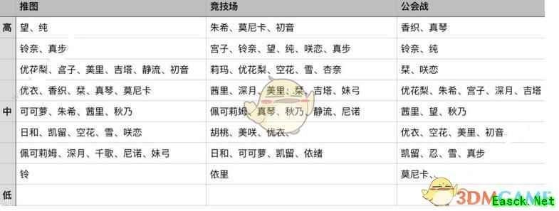 4、【美理】外号:圣母 ◎ub:姐妹互助 中幅度恢复己方全体 HP ,并且小幅度提升魔法防御力 ◎技能一:神圣力量 小幅度提升所有周围我方的魔法攻击力 ◎技能二:爱之治愈 赋予最前方1名伙伴持续恢复HP的状态 ◎EX/EX+:天女的威严/天女的威严+ 战斗开始时,中幅度(大幅度)提升自己的魔法攻击力 ◎攻击模式 起手:1→2 循环:普→普→1→普→2 ub群奶加上二技能的持续回血buff推图会用到,jjc使用较少,工会战少数情况下作为法术辅助登场 专武后为工会战法队辅助核心 六星未实装 ◎培养建议:推图和工会战使用,推图有困难可考虑培养,如果没有则培养优先度靠后 5、【千歌】外号:绿毛 ◎ub:希尔芙的祝福 【召唤】中幅度恢复不在千歌身后所有伙伴的 HP,并且于最前方的伙伴身边唱唤妖精 ◎技能一:加油之歌 以最前方的我方为中心,中幅度提升范围内我方全体的物理攻击力 ◎技能二:妖精们的安眠曲 对面前的 1 名敌人造成中幅度的物理攻击力下降 ◎EX/EX+:天赐之音/天赐之音+ 战斗开始时,中幅度提升自己的魔法攻击力(并小幅提升自己的魔法防御力) ◎攻击模式 起手:1→2 循环:普→普→1→普→2 ub保不住中后排所以推图不太会用,小精灵就是个送TP内鬼所以jjc不会用,工会战用不到 专武后工会战少数情况要用到 六星未实装 ◎培养建议:不建议培养 6、【惠理子】外号:病娇 ◎ub:致命惩处 对面前的 1 名敌人造成大幅度的物理伤害,并且若使用此技能将敌人击倒,则自己的物理攻击力将大幅度上升 ◎技能一:妄想 小幅度提升自己的物理攻击力 ◎技能二:剧毒打击 对面前的 1 名敌人造成中幅度的物理伤害,并且使其陷入中毒状态 ◎EX/EX+:狂爱之力/狂爱之力+ 战斗开始时,中幅度(大幅度)提升自己的物理攻击力 ◎攻击模式 起手:1→2 循环:普→2→普→2→普→1 专武出来前几乎都不用 专武出来后有着堪称外挂级别的物理buff,顶级的物理输出 六星未实装 ◎培养建议:专武出来前不着急养,但先安排刷hard本的碎片,专武出来后后务必培养一个