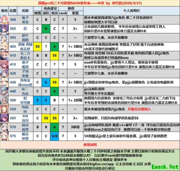 外号:白毛,妈 辅助手(必练) UB 增加全部队友的物攻及魔攻,并回复自己HP skill1 对眼前目标造成物伤 skill2 小量增加物攻及行动速度 EX skill 增加自己物攻 EX+额外增加魔防 行动模式 开场 skill2→skill1 loop 普攻→普攻→skill2→普攻→skill1 评价 PVE中高 Pbsp; 中低(我没用过) 公会战必练前期白送,且一星就可以使用。 推图如果你入坑早或者没有其他物理辅助角色(如和服春田,圣诞千歌,情人节姐姐,泳装可可罗等),选择可可罗是你不二的选择 开服版本推图作为没有姐姐的顶替来使用(推图三号位尽量用能抗的)本身抗度还不错。 可以通过技巧把可可罗卡到一号位减小自己t的压力(最少三星)。 还能加速和加物攻。比较全面的辅助角色。pvp方面来用作为没有、毛二力的下位替代。 公会战基本一直活跃。每次快退环境了,cy就会加强一波。 升星方式为H副本skill1为向前戳三下造成三次同样的物理伤害技巧:skill1技能打出第三段伤害是按ub即可。 有部分极限轴是要求第三段伤害数字不能全部显示抄作业时要注意(实在不行就放弃第三段伤害即可) 以上就是小编整理的关于《公主连结Re:Dive》中卫强度排行的全部内容,更多游戏攻略请持续关注手游网! |