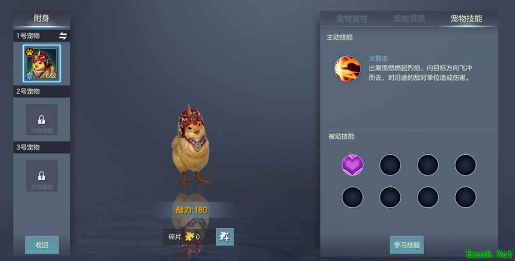 萌宠初见 深藏不露战斗鸡 当玩家对游戏有了一定了解,达到一定级别时,系统就会自动解锁宠物系统供小伙伴探索。初次解锁,每个玩家都可以获得一只头戴花帽的绒球鸡,鸡如其名,明黄色的羽毛覆盖全身,远远望去,可不就像一只黄色绒球。这只小鸡走到哪都是一幅傲娇的小表情,当然因为它更是公鸡中的战斗机。战场中它的独门绝技“火箭击”,可飞冲出去对敌手造成烈焰伤害,果然小鸡也不能貌相。