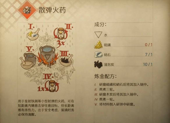 在天国拯救2中,除了玩家们最常用的冷兵器之外,游戏中还能使用火枪进行战斗。而在游戏中玩家火枪弹药耗尽后可以使用炼金台进行制作。那么今天小编就为大家带来散弹火药的制作方法,下面是详细教学。 散弹火药 成分 水、硫磺、1个石、1个泡炭。 配方 1、对硫磺和硝石进行研磨,将其加入锅中。 2、熬煮三轮。 3、研磨木炭后将其加入锅中。 4、将材料倒入研钵中研磨。 效果 用于发射铁屑等小型射弹的火药,可在短距离内随意击穿任意目标,但长距离难有杀伤力。 注意:在制作火药时需要保持清醒状态,醉酒时火药将爆炸。 |