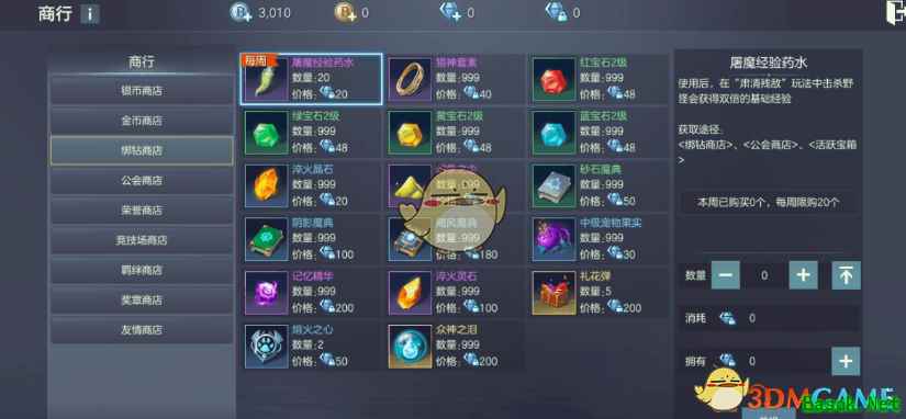 2、商行 在商行中,用过关钻石可以进行各类强力神宠的购买,且这类型的宠物都是其他玩家上架的,如果遇上资质较高的宠物时,建议在入手前认真考虑一番。