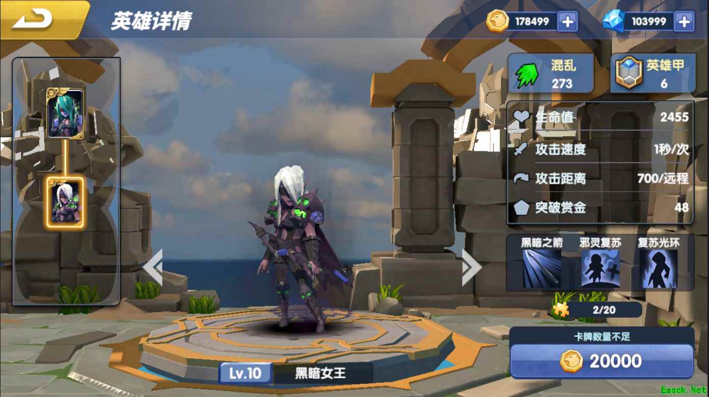 黑暗女王技能介绍: 黑暗之箭:同时攻击1000码范围内的3个敌人,造成150%攻击力的混乱伤害,冷却时间2秒。 邪灵复苏:被黑暗游侠杀死的单位将会重生为一个友方骷髅仆从(骷髅仆从继承黑暗游侠35%的生命值和攻击力,180/近战,物理攻击,重甲,召唤单位,存在时间20秒)。 复苏光环:700码范围内友方单位(建造价格高于135块魔晶)死亡时会重生为1个友方骷髅仆从,存在时间20秒 晕眩:使目标在一段时间内无法行动 以上就是小编为大家带来的内容,更多游戏资讯请关注游戏网。 |