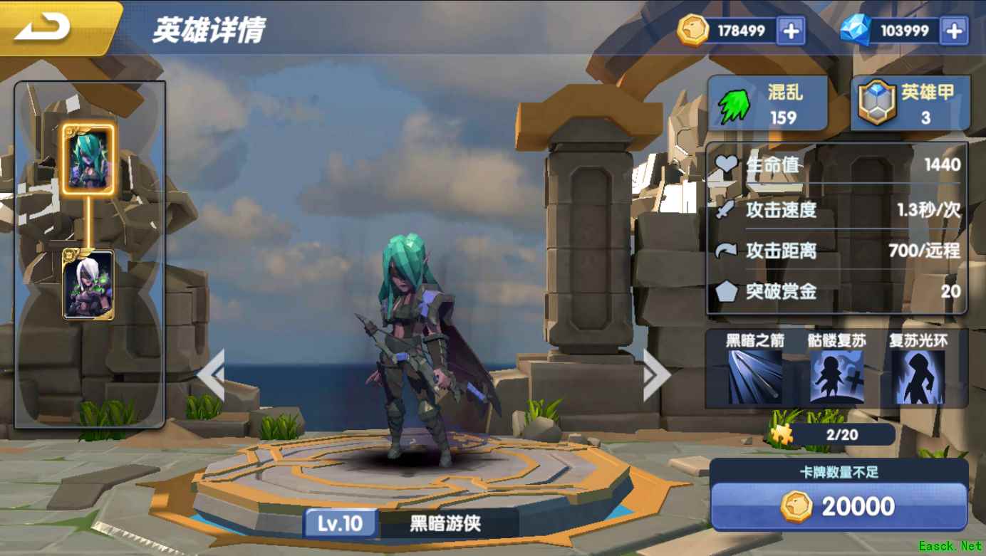 搭配推荐: 小黑+致命怨灵(怨灵可以连接敌方5个单位,搭配小黑1技能可以稳定输出) 搭配考量:小黑升阶+伤害法术+输出后排 法术推荐:常规治疗+伤害法术(保证友方单位存活,给小黑更多输出环境,伤害法术补输出) 可根据敌方前排兵种护甲放置克制输出单位,后期在小黑输出的同时,释放伤害法术,补上前排或者后排输出 由于黑暗游侠属于稳定输出,通过小黑召唤骷髅仆从的能力,出会复活的前排腐生亡灵,复活的兵种会额外召唤骷髅小兵,中期怨灵,也能让小黑稳定输出敌方多名兵种。 英雄克制:小黑是输出较为稳定的后排英雄,要防止被酋长剑圣这类爆发英雄快速击杀前排。从而降低小黑的输出环境