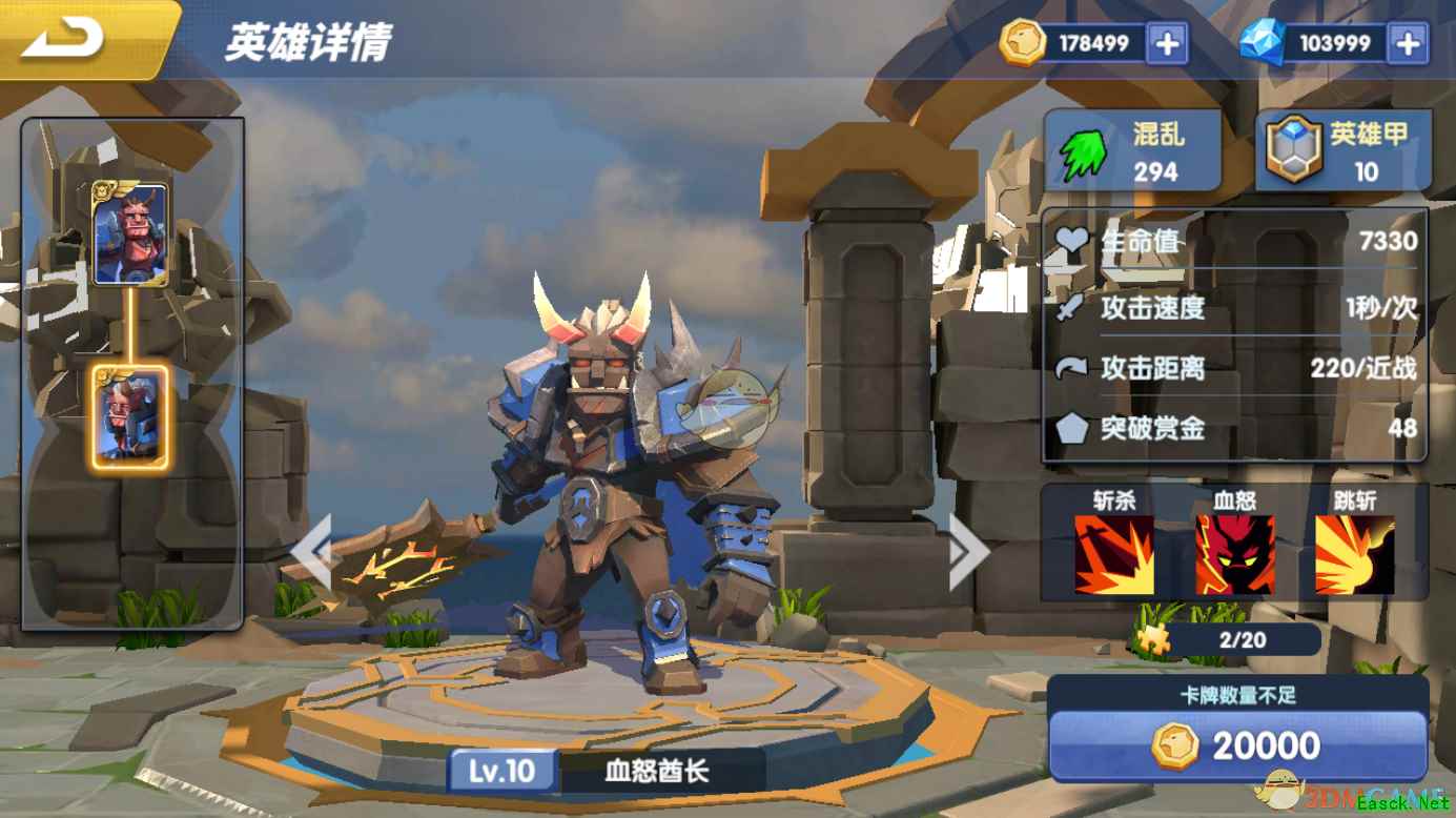 斩杀:当前敌方目标生命值低于20%(斩杀血线)时,直接将其击杀,冷却时间8秒 血怒:每击杀1个敌方单位,增加1层血怒层数,每层血怒会将斩杀线提高2%(初始为20%,上限至30%),血怒效果持续五秒,血怒状态下击杀敌方单位将刷新血怒时间 跳斩:每击杀1个敌方单位,跳跃向生命值百分比最低的敌方单位,直接造成该单位20%生命值的攻击,并额外造成血怒层数*2%的生命值伤害 血怒酋长(混乱攻击—英雄甲)