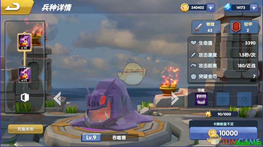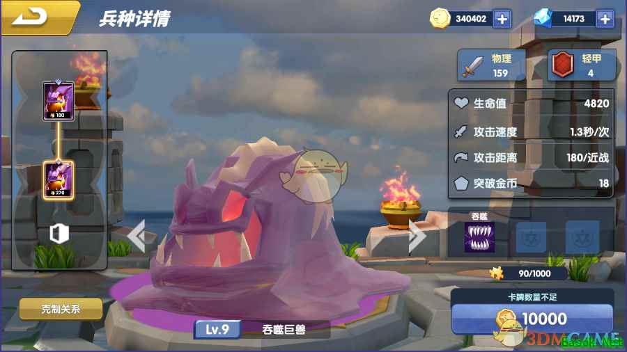 主动技能:吞噬,冷却时间30秒 吃掉敌方生命值低于自身基础生命值25%血量的目标。 吞噬,消灭敌方单位 克制关系: