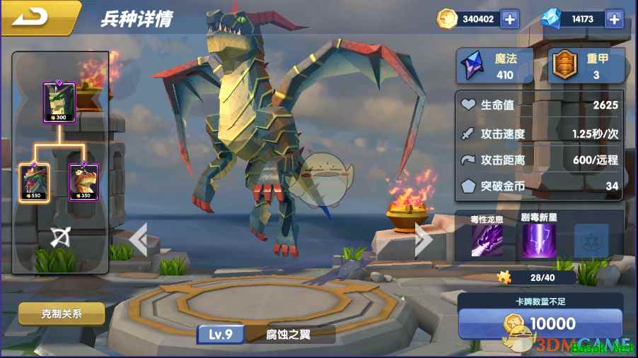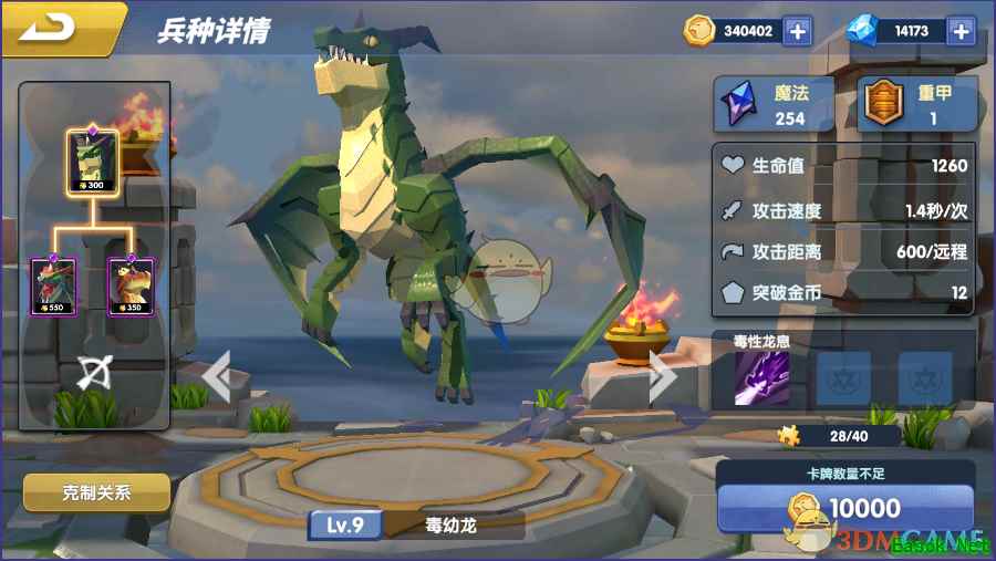 被动:使被攻击单位降低15%移动速度和攻击速度,持续5秒。毒性龙息结束时对目标造成200%攻击力魔法伤害,若目标在毒性龙息持续期间死亡,则对周围(300码)内造成70%攻击力魔法伤害。 心得 这个进化分支给予了其更多的输出,对于消弱效果已经够用的情况下爱,进化这个分支可以大幅提升原本毒龙输出不够强力的短板,而且其亡语效果对于多人口时有额外优势。 克制关系: