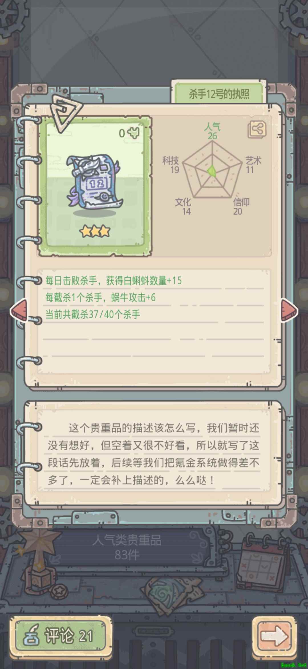 绿贵:杀手12号的执照 (每截杀一个杀手,蜗牛攻击+6、每日击败杀手,获得白蝌蚪数量+15。0/40)