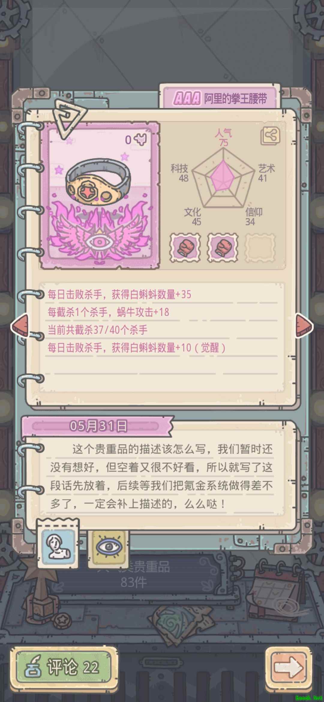 紫贵:阿里的拳王腰带 (每截杀一个杀手,蜗牛攻击+18、每日击败杀手,获得白蝌蚪数量+35。觉醒:每日击败杀手,获得白蝌蚪数量+10)