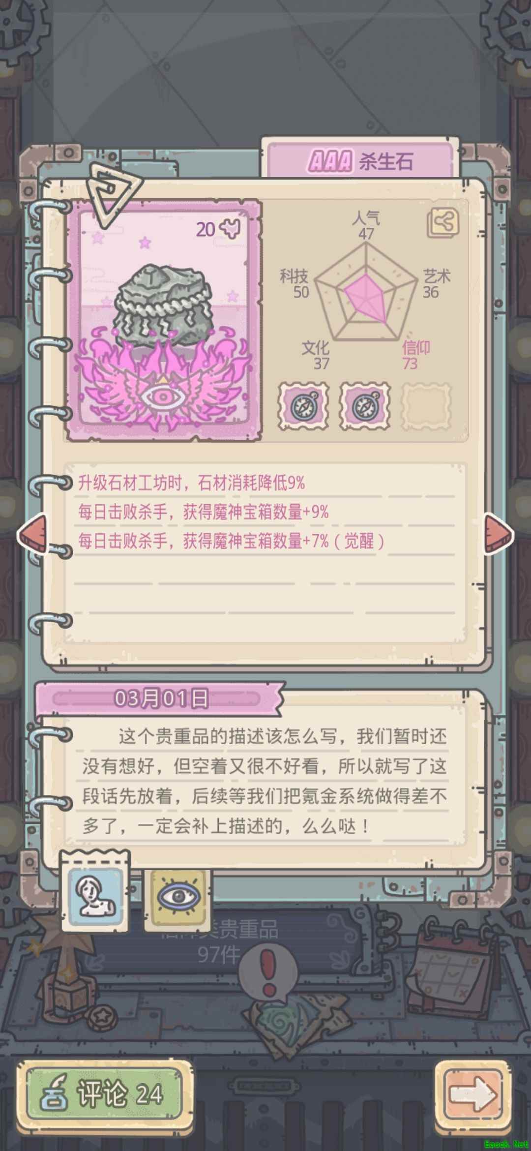 紫贵:杀生石 (升级石材工坊时,石材消耗降低9%。每日击败杀手,获得魔神宝箱数量+9%。觉醒:每日击败杀手,获得魔神宝箱数量+7%)