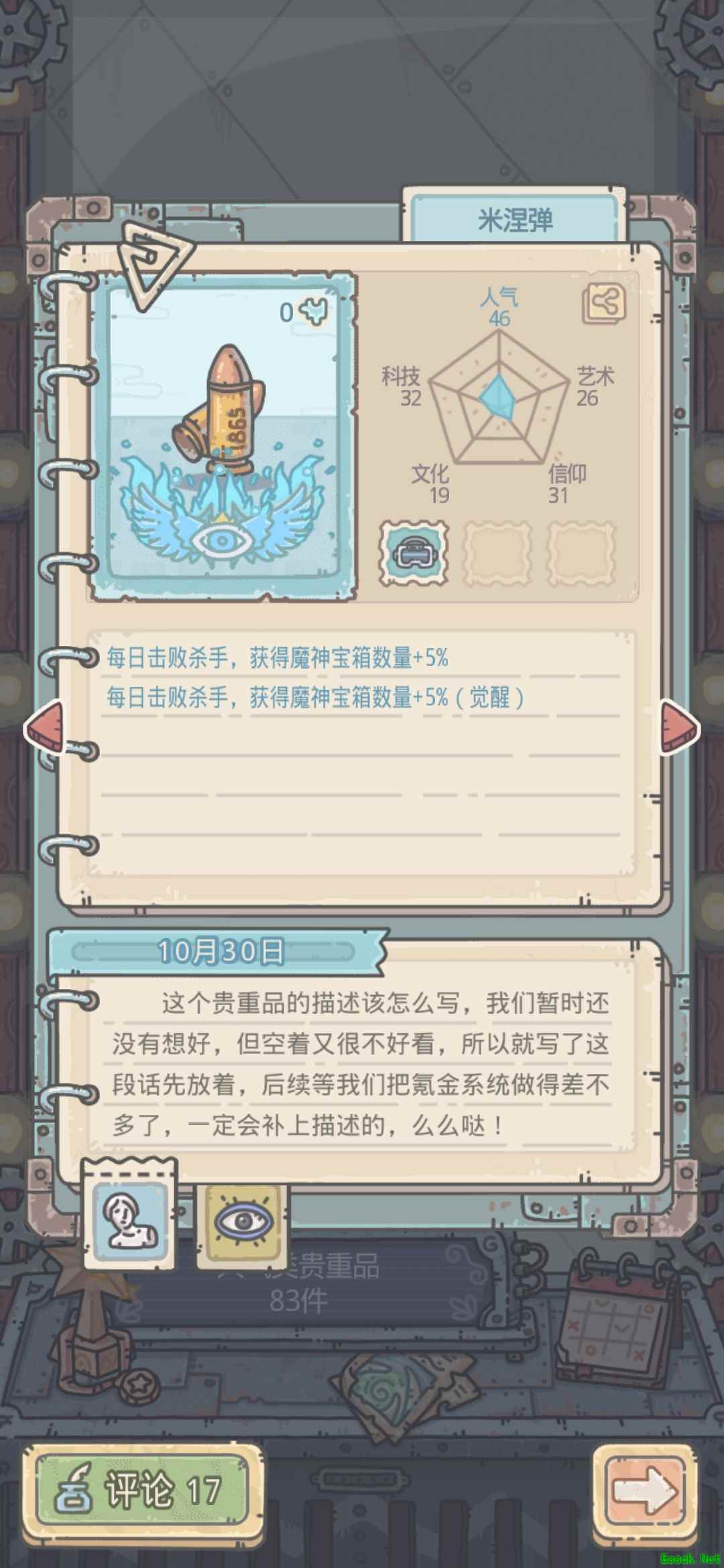 蓝贵:米涅弹 (每日击败杀手,获得魔神宝箱数量5%。觉醒:每日击败杀手,获得魔神宝箱数量5%)