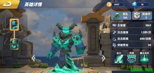 《荣誉指挥官》英雄魔王测评魔王 英雄进阶:邪能魔王 混乱:156 英雄甲:3 基础属性 生命值:1865 攻击速度:1.3秒/次 攻击距离:600/远程 突破赏金:20