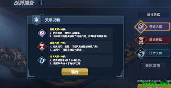 2、初始阶段可以选择对应天赋,包括突破天赋、建造天赋、法术天赋,不同天赋所带来的收益也不同。 3、3V3对决共有6人进行对战,我方3人与敌方三人首先进行1V1对决,待击败敌方战神后,兵线会传送到第4条战线,一旦第4条战线的战神血量为0则游戏结束。
