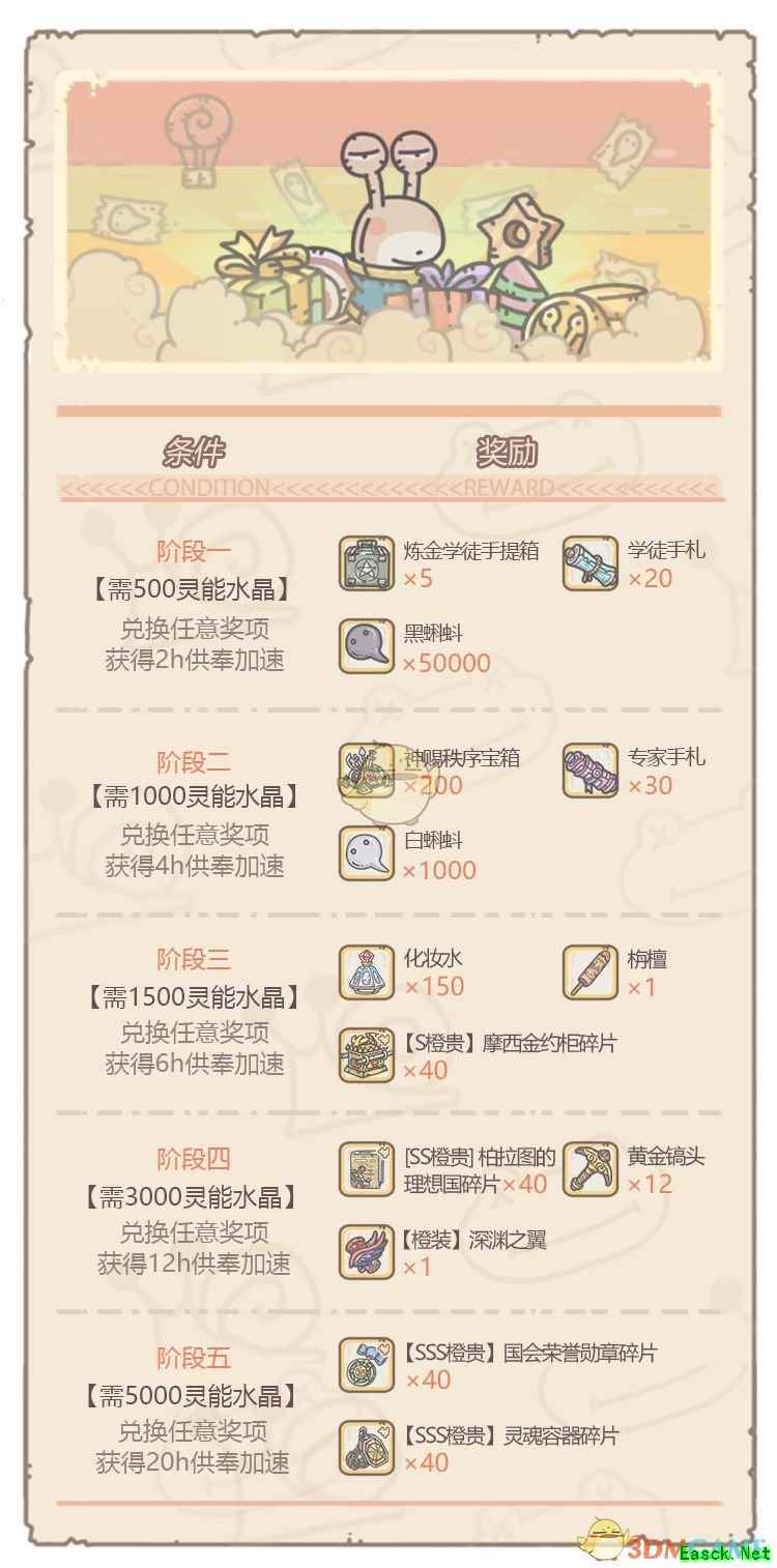 《最强蜗牛》水晶大作战玩法攻略活动期间,可以消耗活动货币“灵能水晶”兑换奖励。 奖励共分为5阶段,每个阶段有2-3种奖励可以兑换,需要兑换前一阶的任意一种奖励,才可以兑换后一阶的奖励。 任意兑换,都会根据奖励阶位,获得额外的供奉加速。 当活动结束后,身上未消耗的活动货币“灵能水晶”会自动转化为黑蝌蚪。 活动期间能灵水晶可兑换的活动奖励如下图所示: