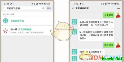 方式二:微信公众号联系 步骤1:微信搜索框中搜索“青瓷游戏客服” 步骤2:回复“人工客服”或“rg”即可与客服小姐姐/小哥哥直接交谈啦~