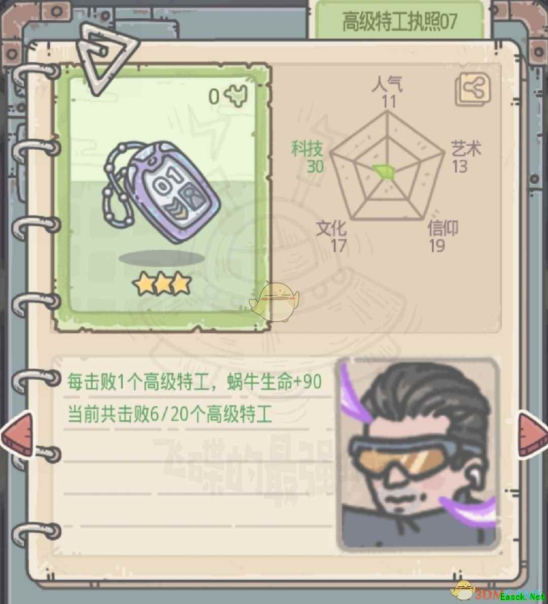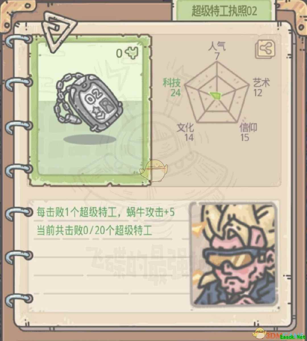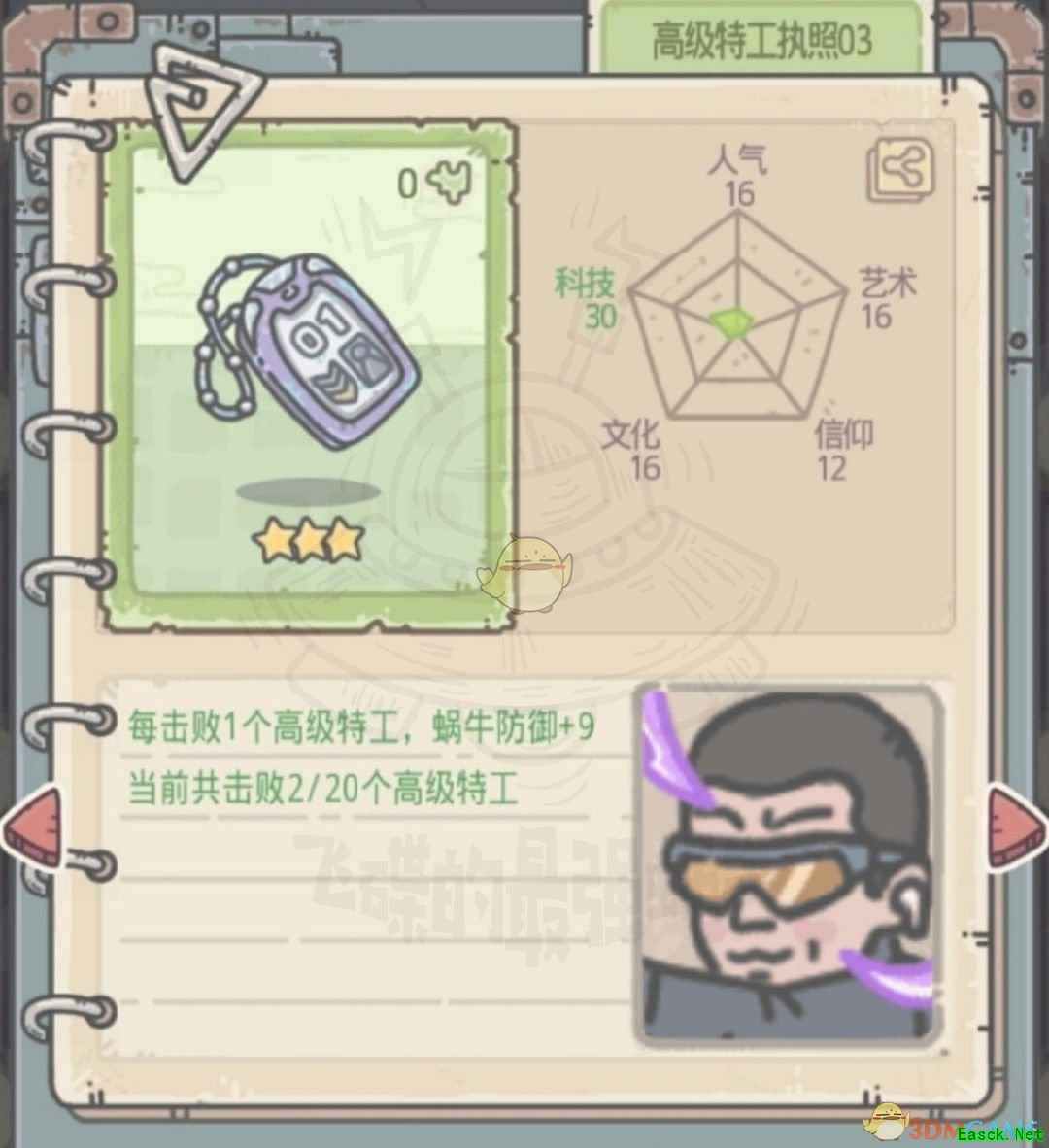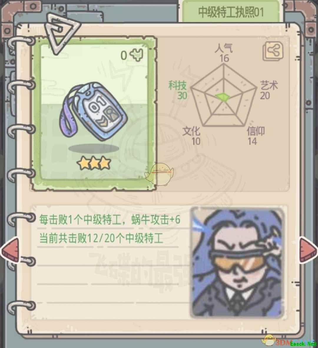 《最强蜗牛》特工执照获取方法特工执照分为两种,一种是正式执照(后面带编号),一种是临时执照。 一、正式执照 正式执照是击败不同形象的特工掉落(超级特工执照01除外),在碰到特工事件时,选择AA即可(一定要打过ta才行哦,打不过什么都拿不到)。下面奉上正式执照信息以及需击败的特工肖像(可通过邮箱中来信的肖像识别)
