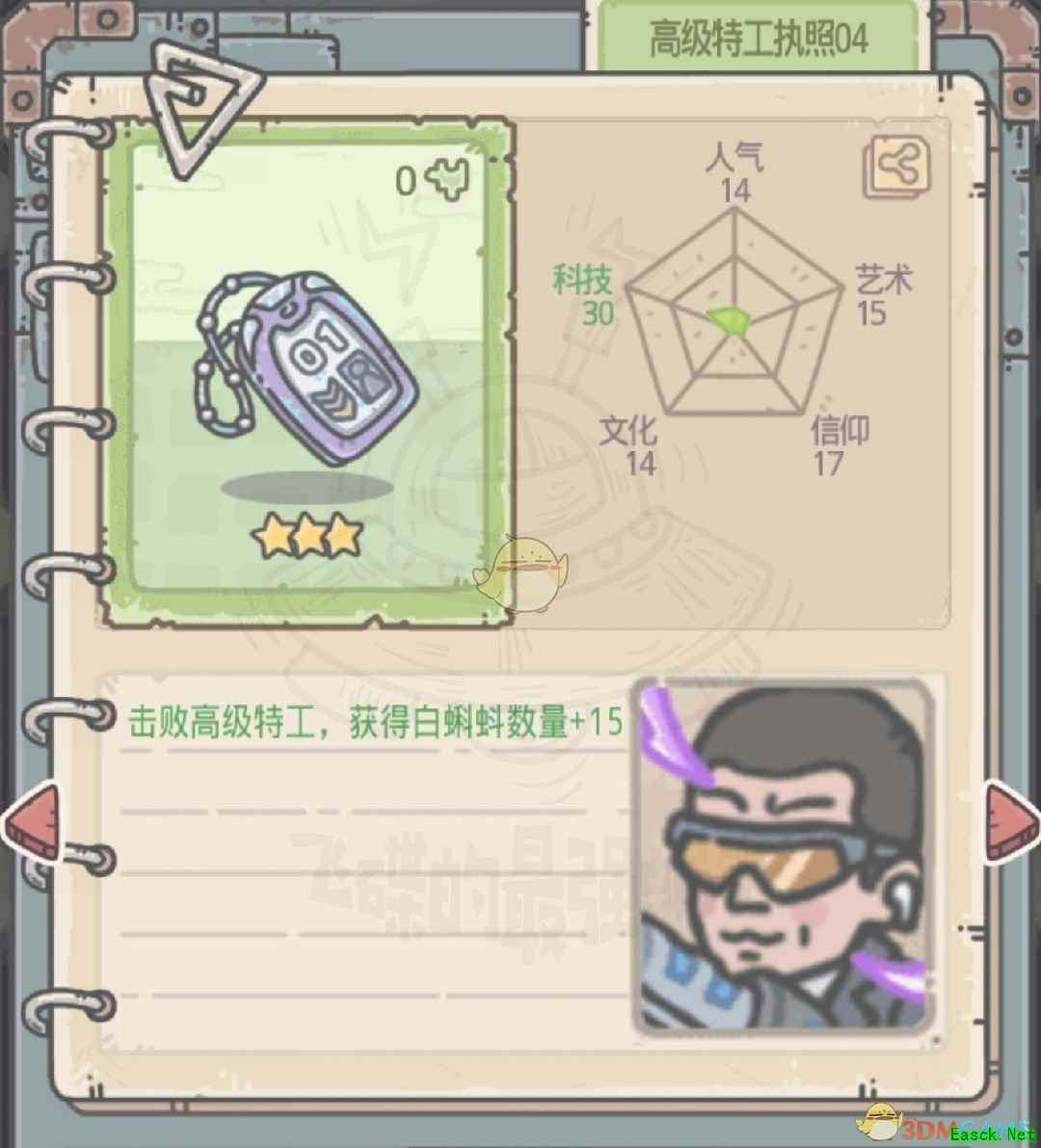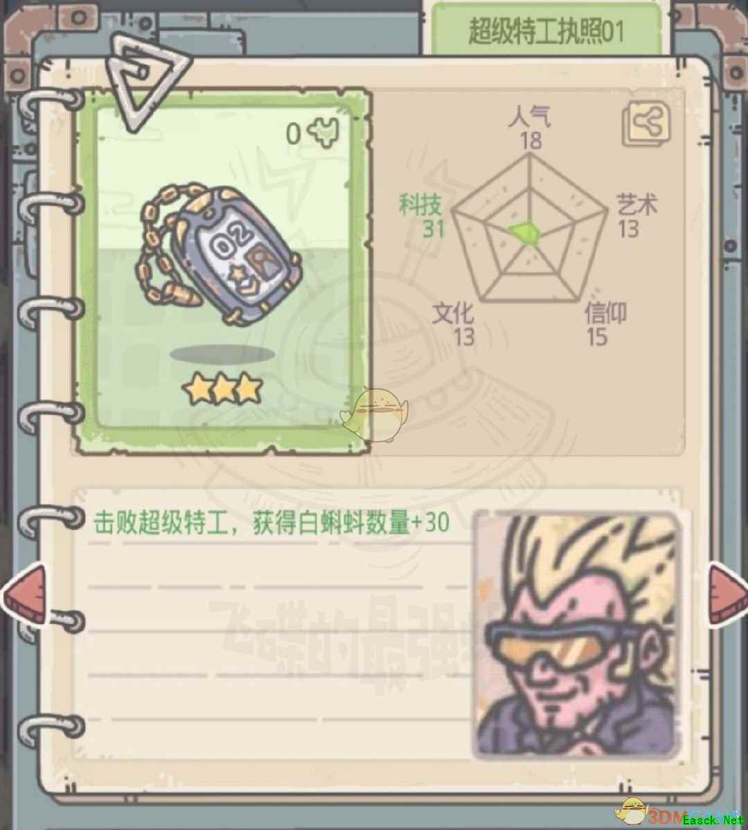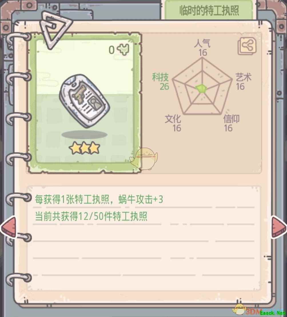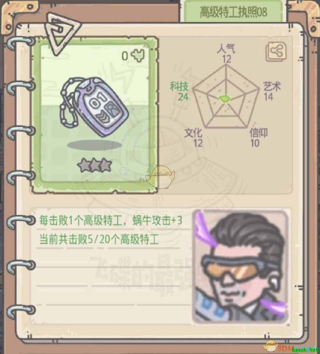 《最强蜗牛》特工执照获取方法特工执照分为两种,一种是正式执照(后面带编号),一种是临时执照。 一、正式执照 正式执照是击败不同形象的特工掉落(超级特工执照01除外),在碰到特工事件时,选择AA即可(一定要打过ta才行哦,打不过什么都拿不到)。下面奉上正式执照信息以及需击败的特工肖像(可通过邮箱中来信的肖像识别)