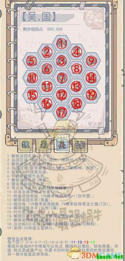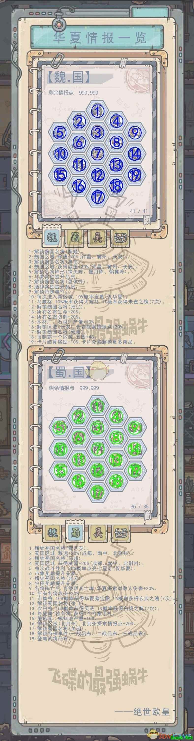 《最强蜗牛》华夏情报加点推荐华夏情报点页优先解锁武将,探索加速及威望。 且每个图大概的加点顺序都可以是同步的,下面给大家列出几个推荐的顺序 1、暴走的情报点 顾名思义,这个加点顺序是优先点出三个国家的探索加速为优先,更快的过图累积情报点, 以点出更多的情报为中心。 国家顺序:蜀国,吴国,魏国(蜀国黄月英有情报点加成,吴国大小乔是威望) 加点顺序:1→2(点满)→4→3→7→12(再以解锁武将为优先级逐个点出来)→16 后面的加点按照自己的需求来点都无所谓。
