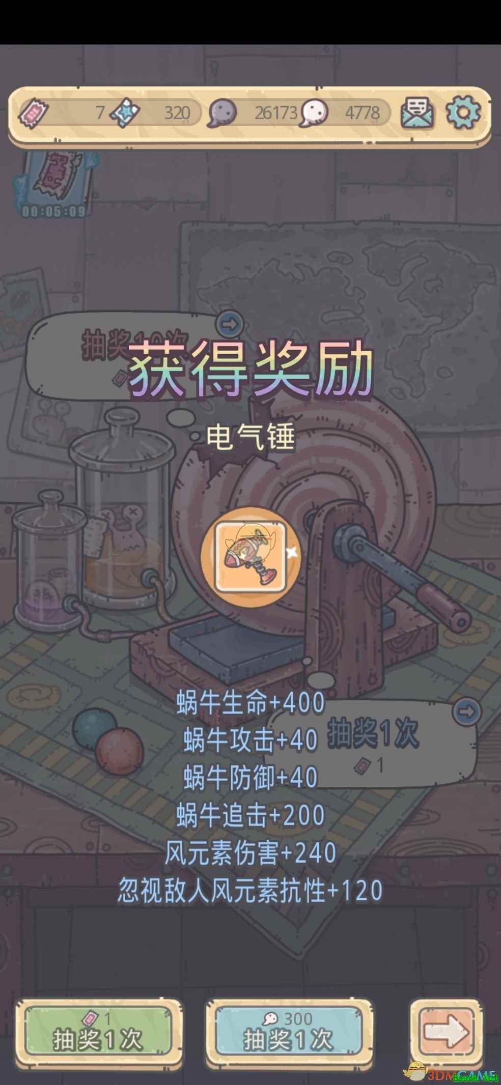 电气锤属性效果介绍【电气锤】 类型:器械类装备档案63号 蜗牛生命+400 蜗牛攻击+40 蜗牛防御+40 蜗牛追击+200