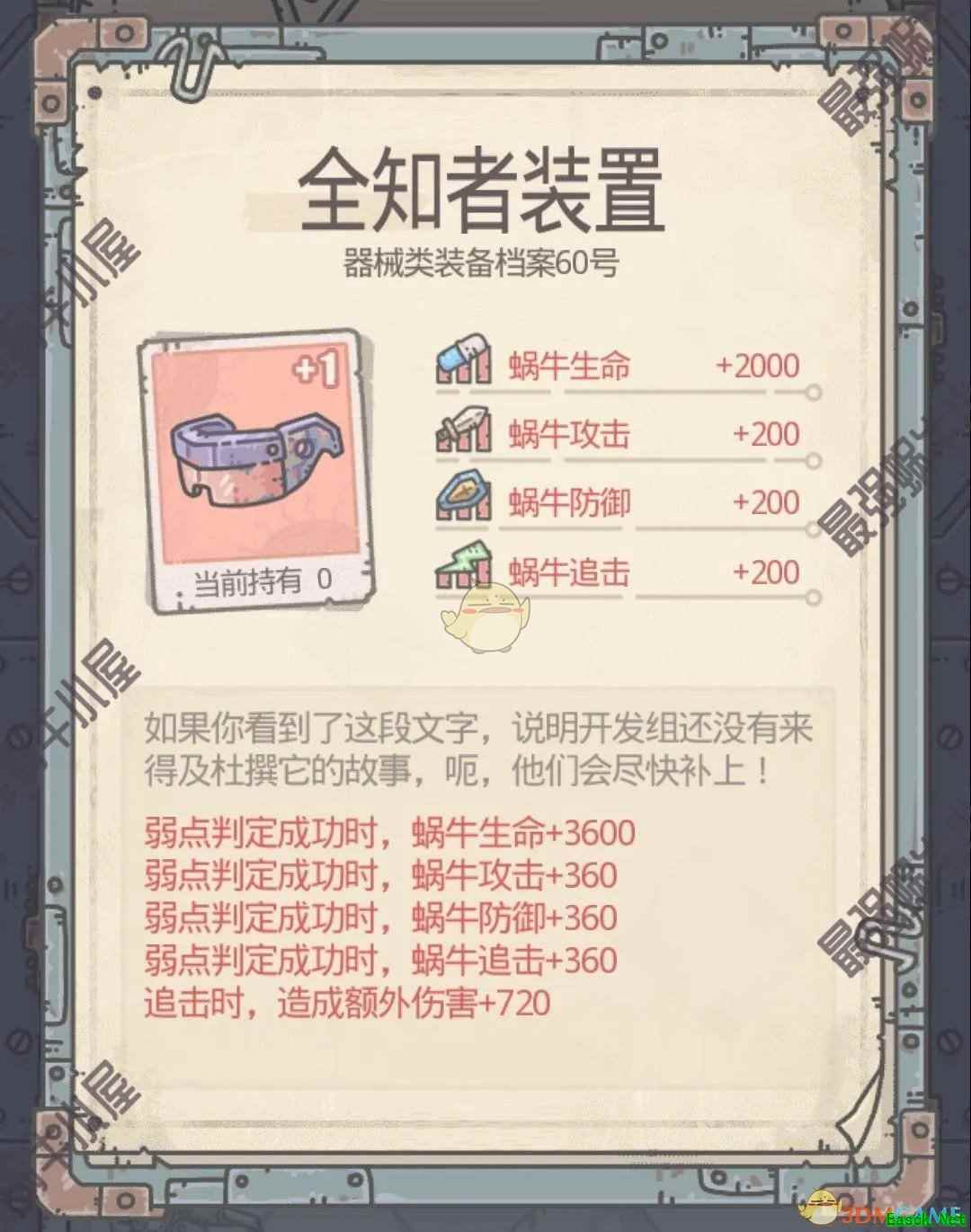 这个装备是开箱子开出来的,来自神赐中立宝箱,初始形态是紫色的还算是好开但是不建议带。 可以看到这个每回合48的追击攻击讲实话,合成没有意义,基本等于浪费了一个装备格。那么再来看+1,是和电气锤合成的,带上一件元素装备之后他的身价立马发生了变化, 但是还是不建议,在不考虑升级的情况下就不建议合成这件+1,单纯的带一个电气锤就好了。反物质护盾和这件装备情况相同。 三、全知者装置