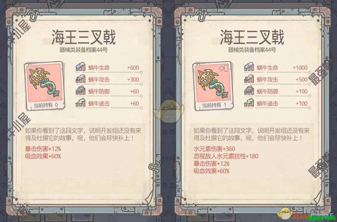 首先登场的是三叉戟,这件装备的获取难度颇高,主要是黑骑士形态较多且最后的强度较大。 这个装备其实单独拿出来还是十分鸡肋的,可以看到两个效果都是效果加成, 但是没有增加概率,所以在自己的概率属性过低的话这件装备就没有太大用处, 建议配合暴击剑和德古拉使用。然后是+1,其实元素装备要合成的都是要带的, 虽然相比之下各种罗盘已经可以提供高额的元素伤害了,但是装备给的元素属性的穿透还是很给力的。 二、怪力菠菜