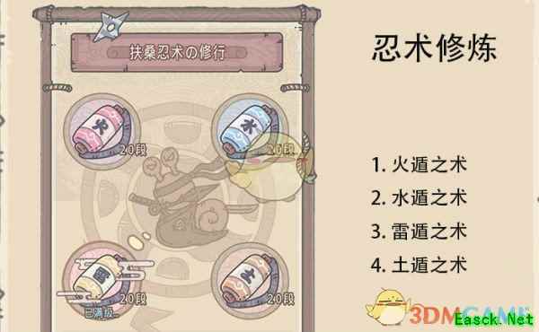 火龙炎弹之术:忍法皆传熟练度增加,五围比例增加额外伤害,满级战斗开始前对敌人造成250%伤害 水遁之术:每级+10蜗牛生命,每8段获得一个水之玉手箱 掌仙之术:五围比例增加额外生命恢复,满级战斗每回合蜗牛生命恢复+50 蛞蝓之术:五围比例增加额外生命恢复,满级战斗每回合蜗牛生命恢复+100 百豪之术:忍法皆传熟练度增加,五围比例增加额外生命恢复,满级战斗每回合蜗牛生命恢复+160 雷遁之术:每级+10蜗牛追击,每8段获得一个雷之玉手箱