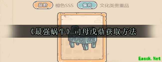 《最强蜗牛》司母戊鼎获取方法商后母戊鼎,又称司母戊鼎、司母戊大方鼎,是商后期(约前十四世纪至前十一世纪)铸品, 于1939年出土于河南省安阳市武官村,现藏于中国国家博物馆《古代中国》基本陈列展厅内 属性