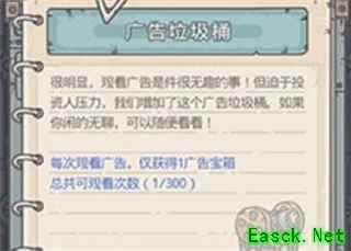 《最强蜗牛》广告垃圾桶作用介绍广告垃圾桶是游戏中一种看广告获取奖励的一种特殊玩法,但是看广告已经很烦人了,以此获取收益也十分浪费时间。 小伙伴们可以选择购买的方式获得广告垃圾桶。 一般而言,玩家每天可以观看五次广告垃圾桶,其后可以收获五个宝箱碎片。其中,100个宝箱碎片可以合成一个宝箱。 也就是说,玩家需要连续20天才能得到一个宝箱。并且,最多玩家可以观看300次,即最终可以收获3个宝箱,但需要玩家花费两个月。