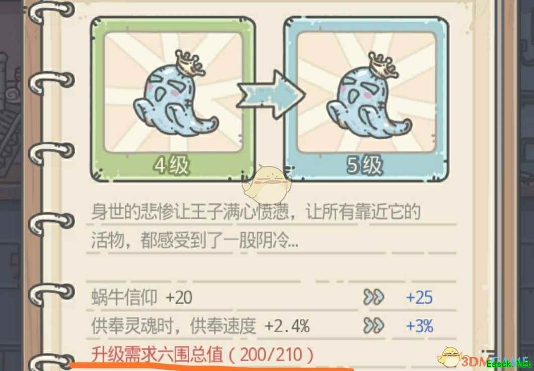 其加速能力无前置条件,直接加速三周一次,计21天理论504小时X%加速。20级王子12%献祭加速。 例504X12%=60.48,原本需504小时,加速后理论只需444小时。【龙珠无法加速】收益60小时,换算商店10小时=600白蝌蚪,20天左右收益3600白蝌蚪。 【平时献祭灵魂不要断,没灵魂了去商店买8小时的】 二、培养