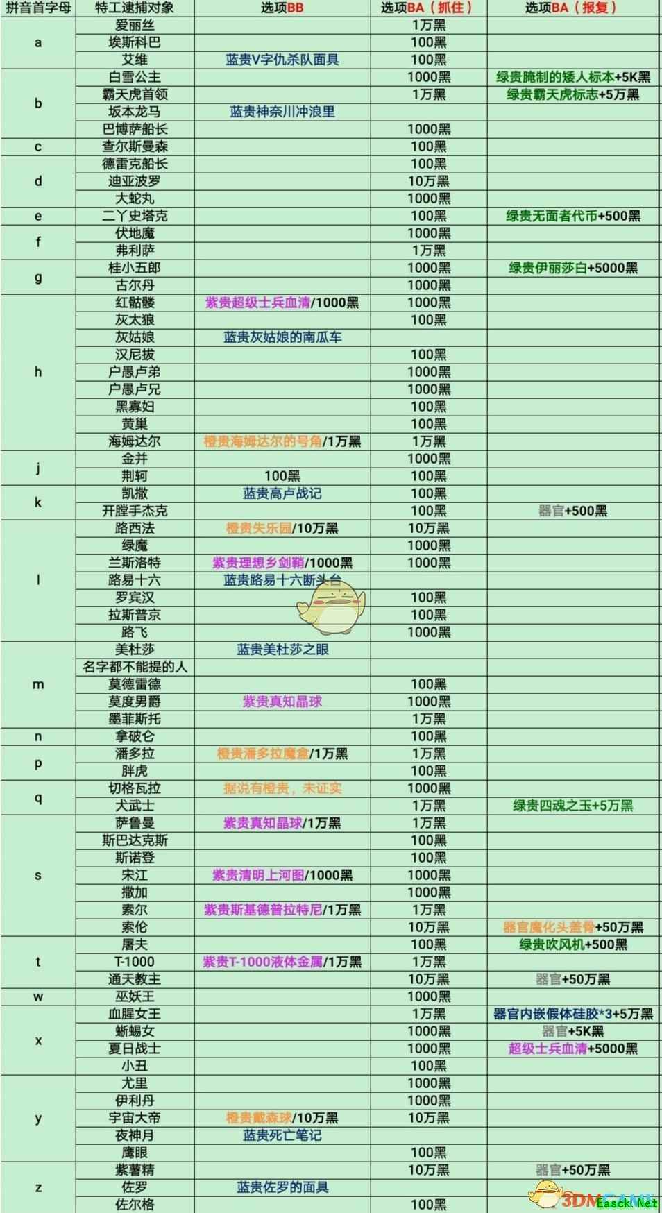 《最强蜗牛》特工回信选择技巧一、选择技巧 1、AA选项打特工,根据特工的等级不同将可以获得对应的证书。 有了证书的话将会获得白蝌蚪、灵魂。 至于特工等级,目前已知的是赛亚人是S级,奥特曼A级,女B级,柯南C级。 2、与特工一样,嫌疑人同样也有等级之分,大家可以根据其被抓之后的奖励来判断。 具体来说,嫌疑人的奖励达到10万/1万/1千/100黑蝌蚪分别对应S/A/B/C。 目前来看的话,估计越高等级的特工有着更高的抓捕成功率,而嫌疑人等级越高可能越不好抓。 3、BB选项如果出现结束流程,就选BA。 而如果是预计耗时2m,还是BB,有比较大的可能获得贵重品。 4、BA选项分为特工抓住、没抓住但未报复、以及没抓住且被报复3种情况。 目前来看的话,抓住大部分都给黑蝌蚪,而被报复则有几率获得贵重品。 5、值得一提的是,不同嫌疑人的BB选项是不是直接结束,还有BA选项是不是抓住和报复,都是不一定的。 而且即使是同一个嫌疑人,选择BB选项之后的奖励也是有所不同的。 6、同一嫌疑人BB的谢礼也可能会不同。(例如潘多拉,有的人拿到了3S橙贵潘多拉魔盒,有的人只拿到了1万黑蝌蚪)。 7、重复性事件,如特工、落魄的贵族等,出现间隔时间为12小时。 至于是否是特工完全随机,大家可以考虑定点去蹲他们。 二、选项结果 1、如遇到表中未有BB及BA报复信息的嫌疑人,建议大家选AA,赛亚人除外! (能打过的巨佬另算)。 2、如果建议1中类型的嫌疑人为S或A级,且上门特工等级不低于嫌疑人等级,想要黑蝌蚪的大佬们可以抓他。 (当然,特工的等级低于嫌疑人等级时也有抓到的可能,只是概率可能较低)。 就目前来看,BB有贵重品的嫌疑人将不会进行报复,而BA报复的嫌疑人选BB将没有贵重品。