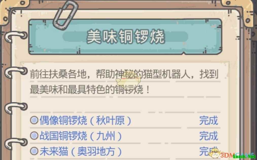 《最强蜗牛》未来猫伙伴获取流程一、获取流程 需要收集到秋叶原的偶像铜锣烧和九州的战国铜锣烧之后找到叮当猫即可完成任务。 完成任务之后需要选择选项并回复未来猫才能结识小伙伴。 获取未来猫,需在扶桑完成特殊剧情【美味铜锣烧】 完成剧情任务需制霸扶桑的(秋叶原)与(九州)区域,制霸=2回合完美击杀,从而在奥羽地区结交机器猫。