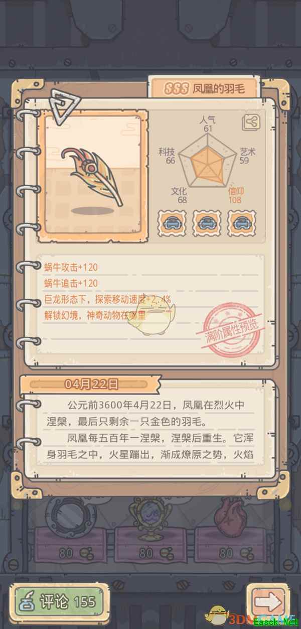 那就是时光机,探索加速产量+24%,探索加速产量增多,那么我们就可以愉快的加速咯 同时,将其放置在蝌蚪池(家园资源系统)中,高阶属性触发,产出白蝌蚪的概率大幅增加,达到30% 筋斗云 筋斗云是2020年7月3日的抽奖活动达标奖励 筋斗云的探索移动速度与麦哲伦的望远镜收益一样都是探索移动速度+2.4%,探索速度决定挂图资源的收益率 同时他也有很厉害的放置能力,放置在华夏博物馆时,可以触发华夏探索移动速度+9% 凤凰的羽毛 凤凰的羽毛,是中期的优质贵重品,当你进入巨龙形态的中期挂图时,这个贵重品能帮你提高探索移动速度+2.4%