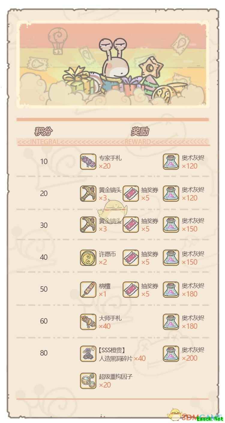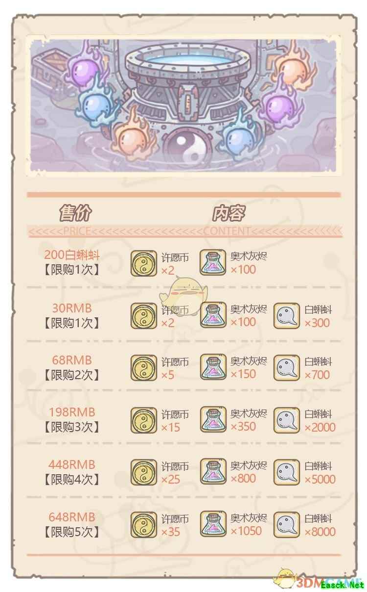 本期活动内容如下一、贩售机福利 活动期间,每天会在贩售机中刷新一个售价为1白蝌蚪的活动福利,内容为:白蝌蚪×20、许愿币×1、奥术灰烬×100。 二、大祈愿之阵 活动期间,每使用八卦炉许愿1次,获得1积分,累积对应的活动积分,可获得以下奖励: