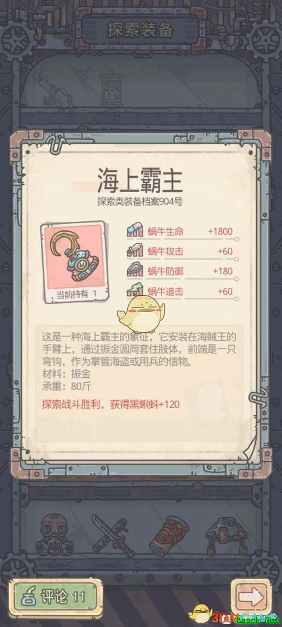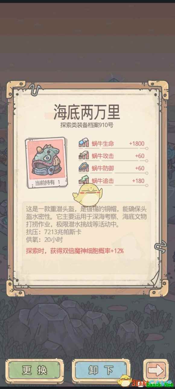 《最强蜗牛》探索挂机装备推荐一、装备推荐 海底两万里、百万吨支撑、海上霸王、大科学家 二、选择理由 在你卡图打不过的时候可以上这些挂机,哪怕你打的过你都可以上!因为影响你扫图的更多的是里面的情报点, 你情报点上来了除了几个难点的其他的都是掉打,几件装备影响不了什么,所以有想法的蜗牛可以现在就上探索装 三、装备属性