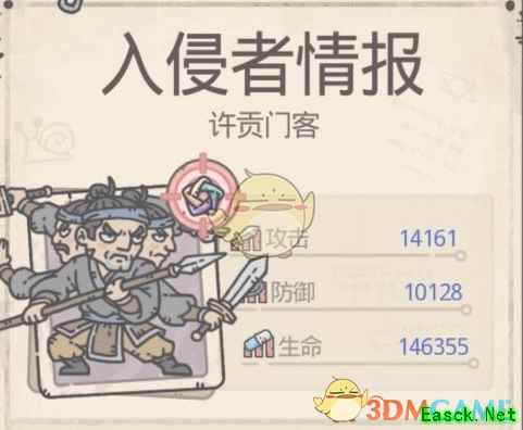 《最强蜗牛》许贡门客战力及打法分析一、解锁方法 华夏情报兑换 吴国情报右边 二、许贡门客战力介绍 入侵者情报中显示许贡门客的三维是: 攻击力14161 防御10128 生命:146355 可以说是十分强力了,也是很多玩家不敢惹的原因