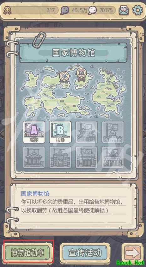 4、点击左下角的博物馆勋章,进入博物馆商店。 5、标注的商品就是明信片,每个地区的明信片只能购买一次。