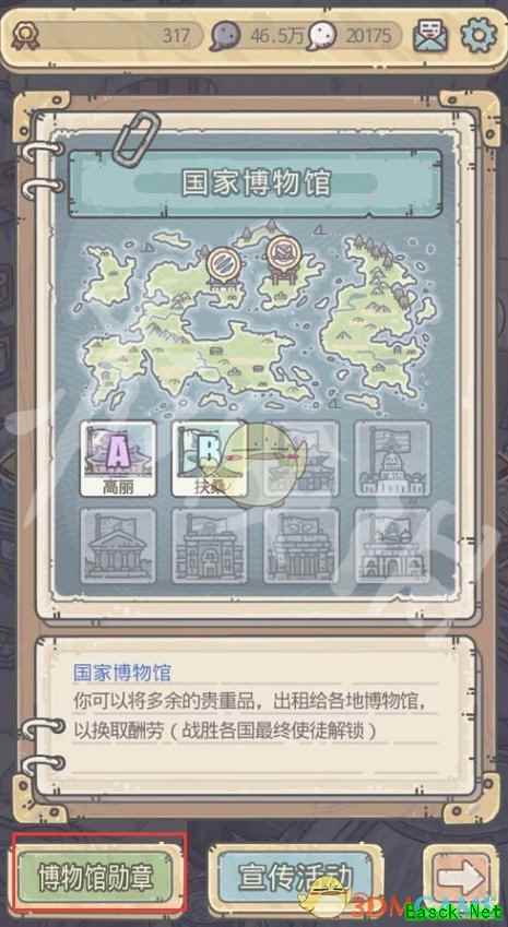 2、点击标记的位置,可以进入国家博物馆页面 在国家博物馆中可以将多余的贵重品出租给各地博物馆(需要打败所有使徒才可以解锁博物馆) 3、点击博物馆勋章即可进入博物馆商店界面,其中的必买品就有明信片,价格不高但有BUFF给玩家,还是非常划算的。