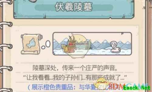二、任务流程 在华夏地图探索时会触发伏羲陵墓的相关任务,要求展示华夏文化相关的一个橙色贵重品。 在展示相关贵重品后即可通关任务,只要符合要求跟贵重品的其他属性无关,所以建议玩家们优先选择自己已经拥有的进行展示。
