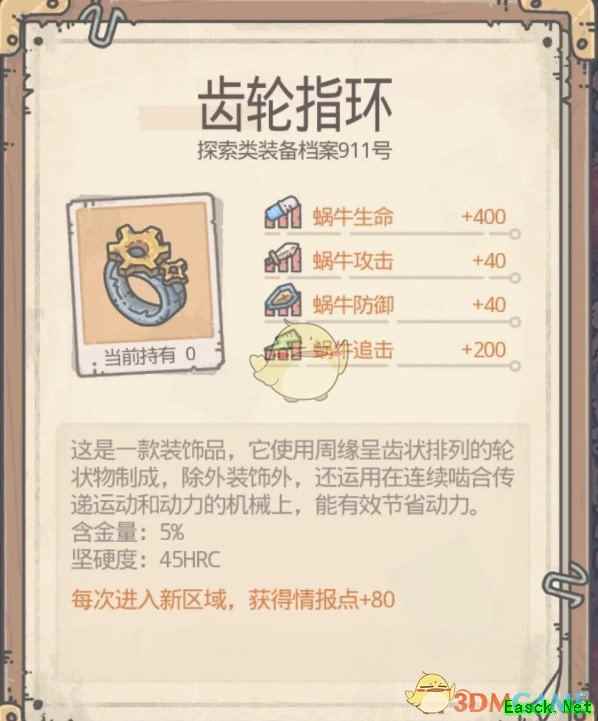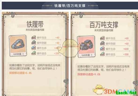 百万吨支撑为蜗牛提供了巨额的移动速度加成,使得蜗牛的跑图效率更高了,是全阶段都能用上的优良装备。 百万吨支撑的收益更兼顾随机性,毕竟谁也不知道。