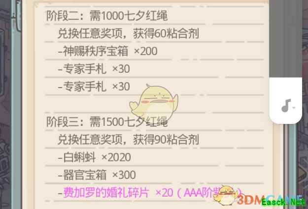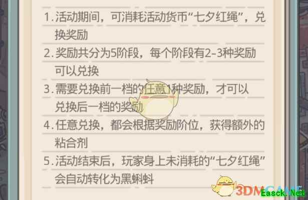 1、活动期间,可消耗活动货币”七夕红绳”,兑换奖励 2、奖励共分为5阶段,每个阶段有2-3种奖励可以兑换 3、需要兑换前一档的任意1种奖励,才可以兑换后-档的奖励 4、任意兑换,都会根据奖励阶位,获得额外的粘合剂 5、活动结束后,玩家身上未消耗的”七夕红绳”会自动转化为黑蝌蚪 可兑换奖励阶段一:需500七夕红绳 兑换任意奖项,获得30粘合剂 白蝌蚪x777 白蝌蚪x777 阶段二:需1000七夕红绳 兑换任意奖项,获得60粘合剂 神赐秩序宝箱x200 专家手札x30