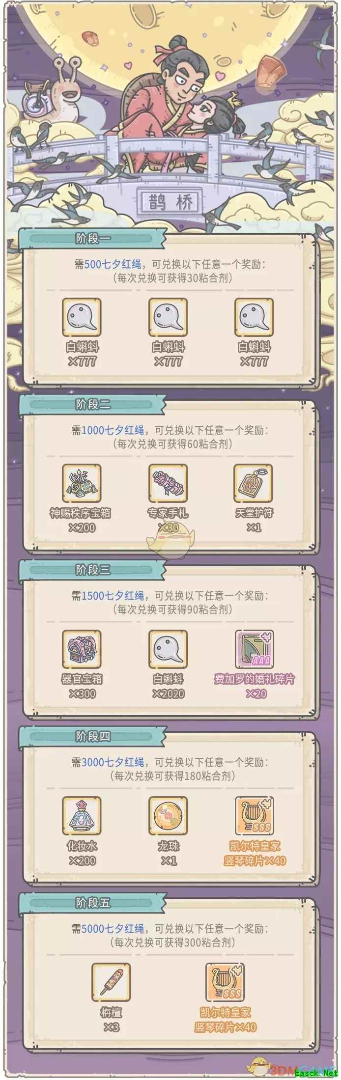 二、喜乐结缘 1、活动期间,可消耗活动货币“七夕红绳”,兑换奖励 2、奖励共分为5阶段,每个阶段有2-3种奖励可以兑换 3、需要兑换前一档的任意1种奖励,才可以兑换后一档的奖励 4、任意兑换,都会根据奖励阶位,获得额外的粘合剂 5、活动结束后,玩家身上未消耗的“七夕红绳”会自动转化为黑蝌蚪 【可兑换奖励】