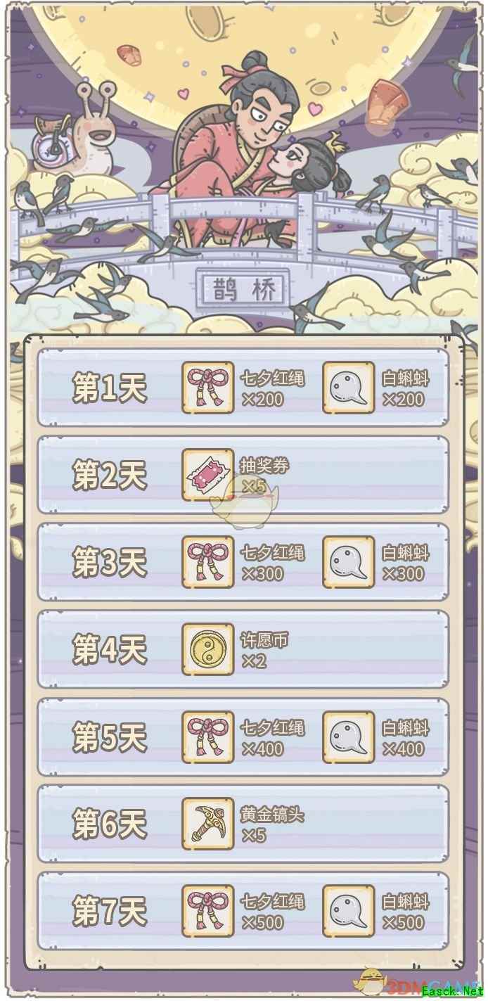 《最强蜗牛》七夕祈缘活动内容一览一、七夕祈缘 活动期间,每天上线可以领取奖励,持续7天。