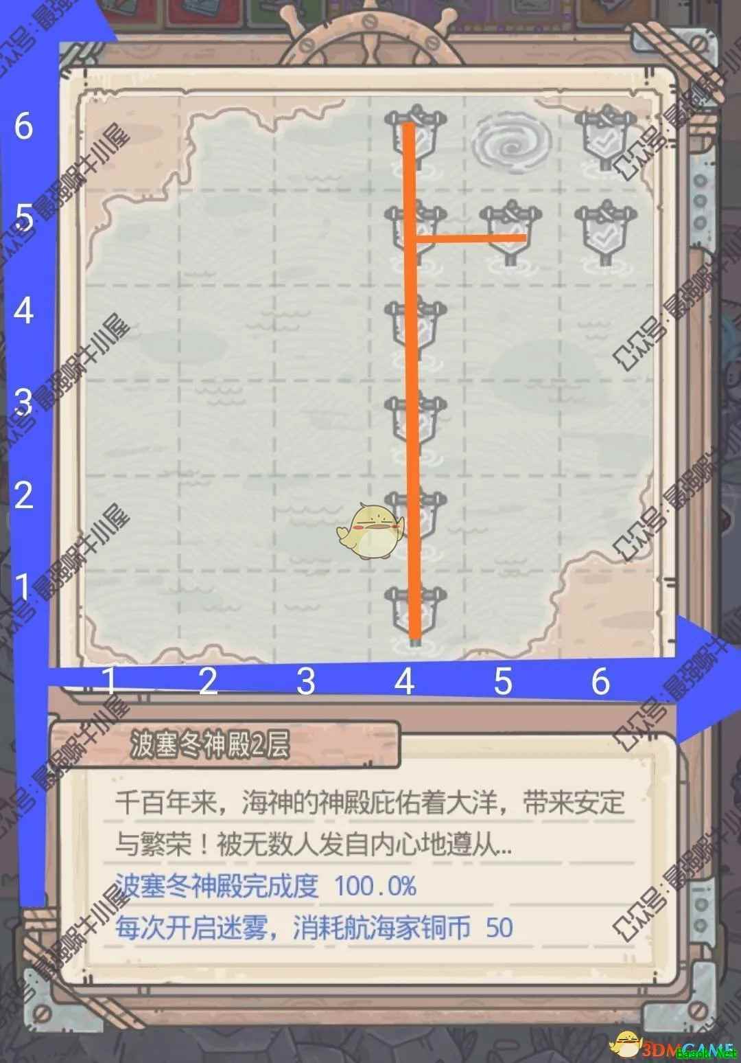 普通小怪(4,1)、(4,2)、(4,3)、(4,4)、(4,5)、(4,6)和(5,5),实力较弱,无特点。 精英小怪(6,5)北冰洋神殿,海战完毕后需进战斗,击败后变为号角,点击后可激活(5,6)处漩涡,可以进入下一层海域。 近代遗迹(1,3)需求考古1级,可获得抱鹅的少年碎片*5。 方尖碑(2,6)。 深海鱼群(2,5)需求捕鱼1级。 古代遗迹(3,1)需求考古2级,可获得腓尼基字母石章碎片*5。 漂流瓶(6,1)拾取后可获得专家手札*2。 神像(6,3)需求信仰12050。