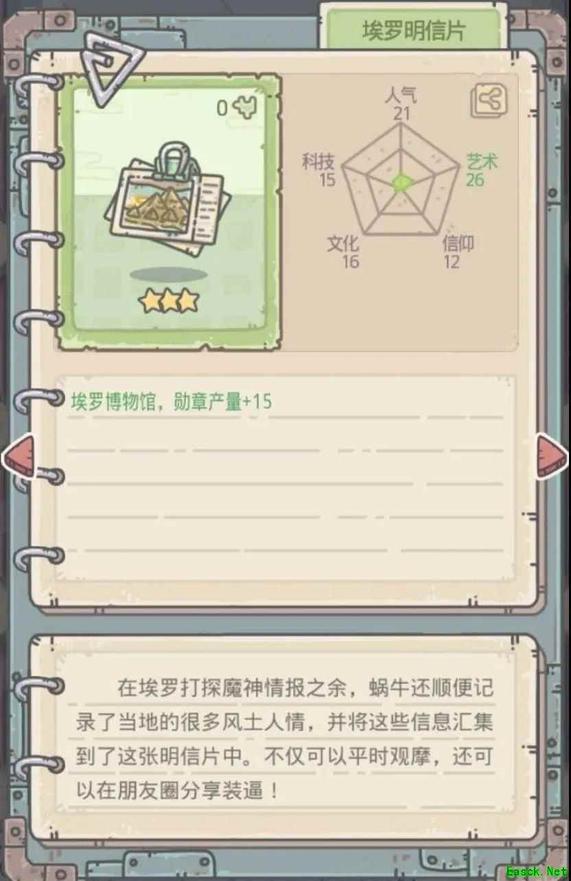在最强蜗牛手游中埃罗明信片怎么获得呢?埃罗明信片是埃及探索达到100%之后在博物馆商店购买获得的。那么想知道埃罗明信片获得方法的就跟随小编一起来看看吧。