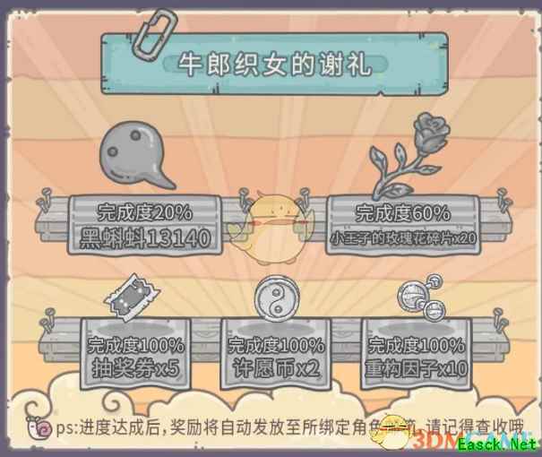 《最强蜗牛》七夕搭鹊桥活动参与方法一、活动介绍 参与方法: https://static.qcplay.com/snail/valentine-day 1、活动时间:2020年8月20-8月26日23:59 2、登录青瓷账号、绑定游戏内角色即可参与修筑鹊桥 3、每个青瓷账号每天有1次修筑机会,每次可获得20%的修筑进度;分享邀请好友,好友点开页面后可帮助完成10%的修筑进度 4、当修筑进度分别达到20%、60%和100%时,将分别获得牛郎织女的谢礼,所有谢礼将直接发放至绑定角色的邮箱,邮件有限期7天 二、奖励一览