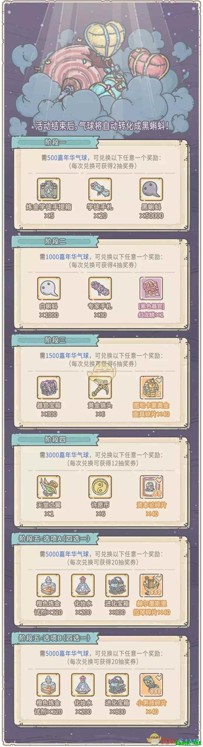 1、活动期间,可消耗活动货币“嘉年华气球”,兑换奖励 2、奖励共分为5阶段,每个阶段有2-3种奖励可以兑换 3、需要兑换前一阶的任意1种奖励,才可以兑换后一阶的奖励 4、任意兑换,都会根据奖励阶位,获得额外的抽奖券 5、活动结束后,玩家身上未消耗的活动货币“嘉年华气球”,会自动转化为黑蝌蚪 【可兑换奖励】