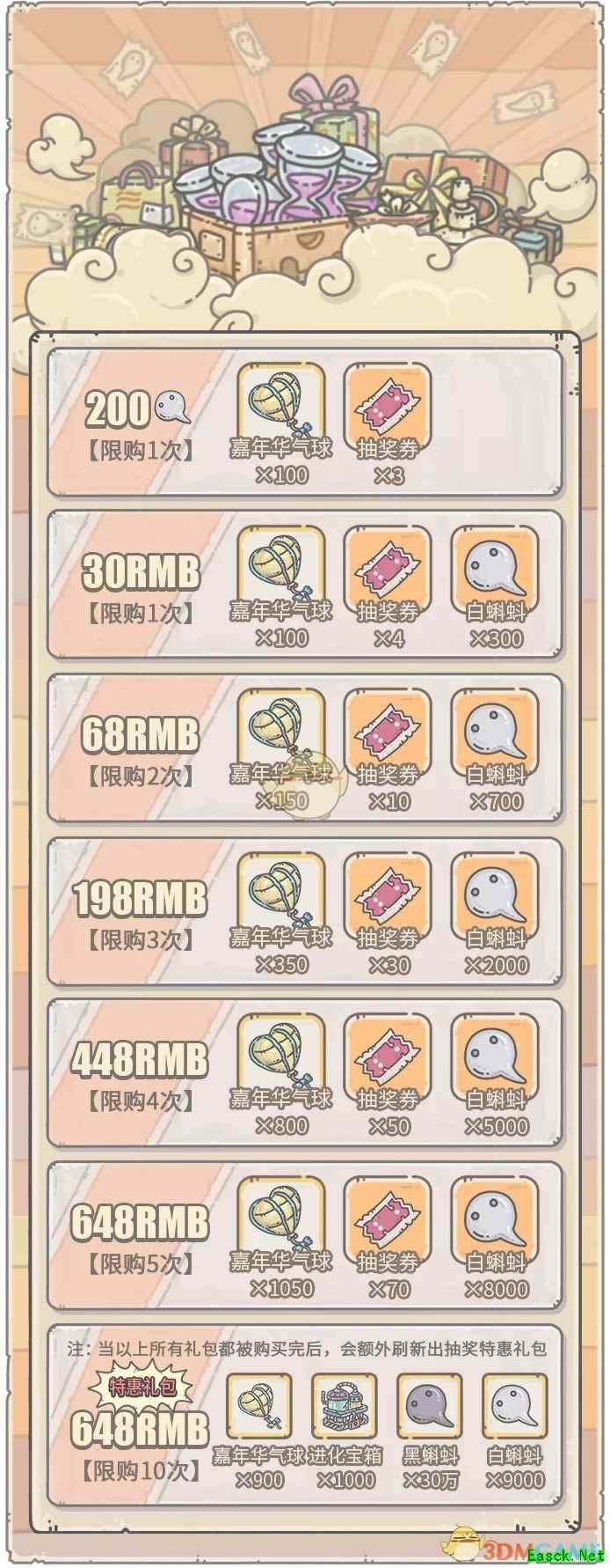 9月25日抽奖周活动内容介绍: 活动期间,每天会在贩售机中出现福利礼包,每天5点刷新,售价1白蝌蚪。内容为:白蝌蚪×20、抽奖券×3、嘉年华气球×100