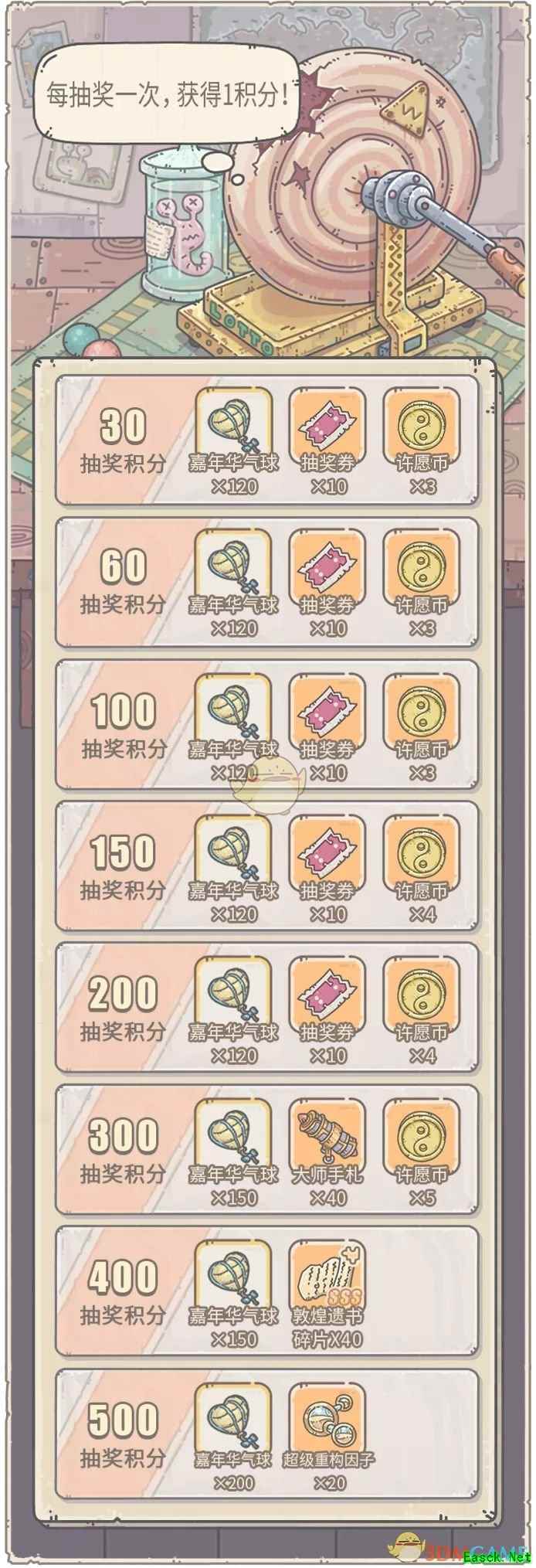 活动期间,每进行1次抽奖,可获得1个积分。累积对应的活动积分,可获得以下奖励。