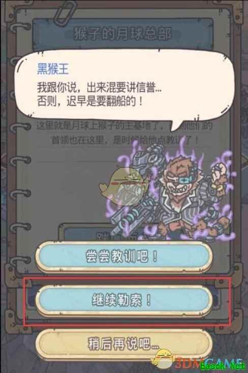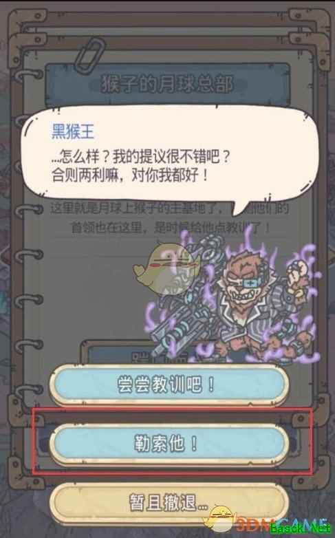 黑猴王选项推荐介绍: 一、选项推荐 1、中秋突袭战中通过20次终点触发事件黑猴王。 2、可以和它对话,先不要打它。 3、选择第二个选项勒索它,可以获得白蝌蚪。(可以勒索2次)